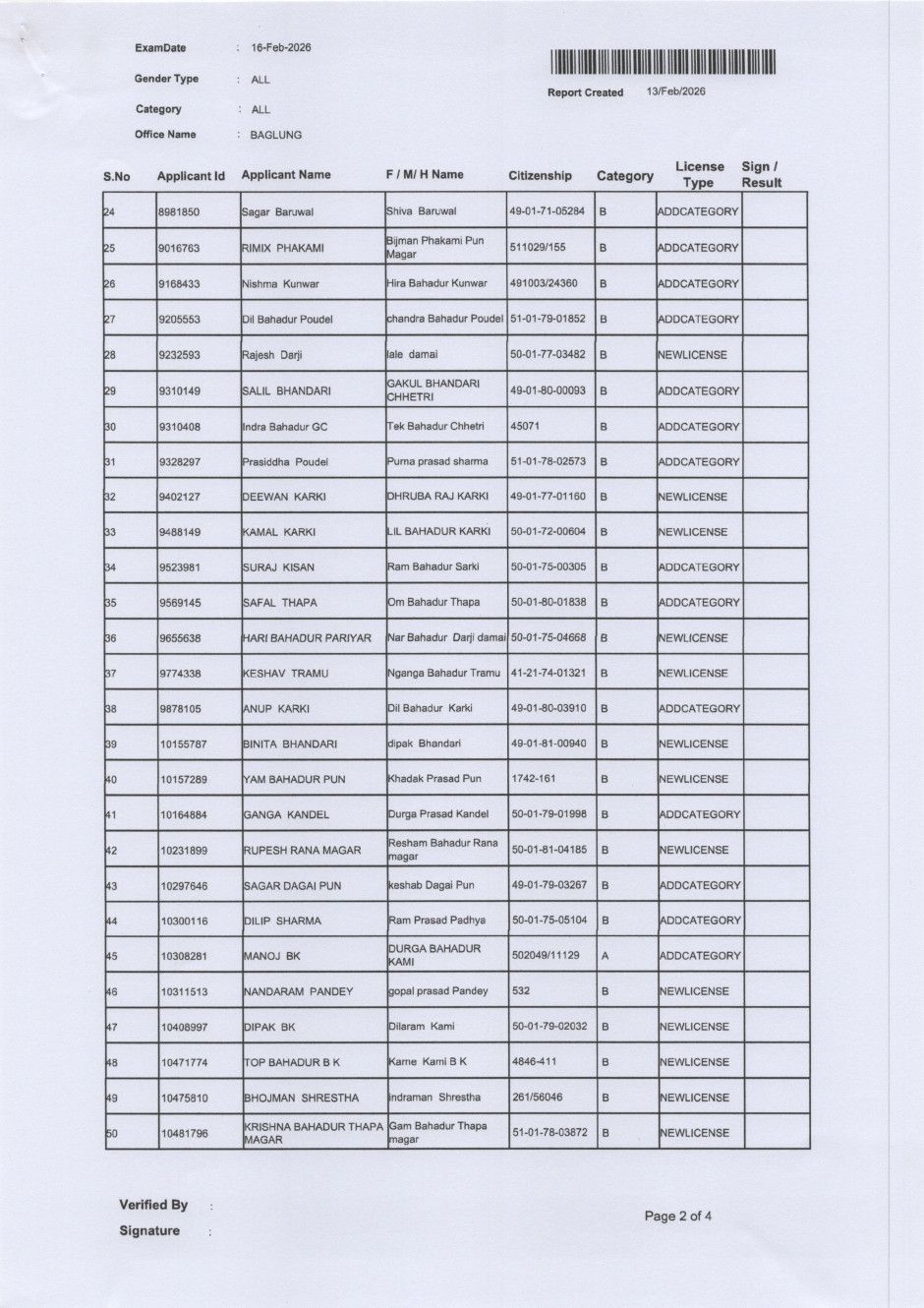 मिति:- २०८२।११।०४ गते संचालन हुने सवारी चालक अनुमति पत्र वर्ग B तर्फको प्रयोगात्मक परीक्षामा सहभागी हुने आवेदकहरुको विवरण Checklist